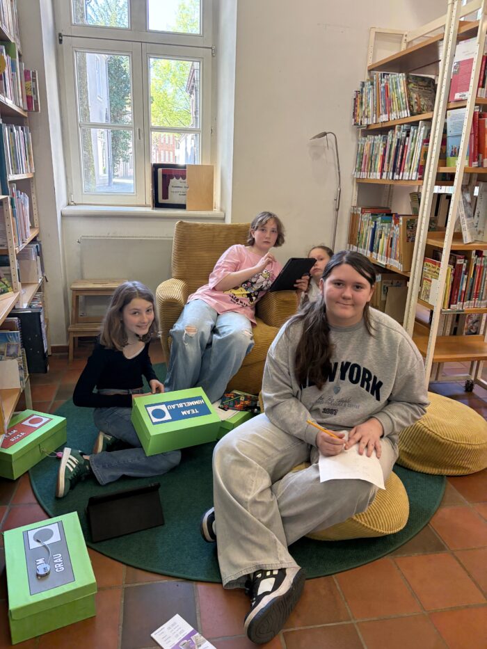Statt still zwischen Regalen zu sitzen, hieß es: Tablet raus und los geht’s zur digitalen Rallye! In kleinen Teams streiften die Schülerinnen und Schüler durch die Bücherei, lösten knifflige Rätsel und entdeckten dabei ganz nebenbei die verschiedenen Bereiche der Bücherei. Wer hätte gedacht, dass man sich hier so gut „verlaufen“ kann – natürlich nur im Auftrag der Schatzsuche!